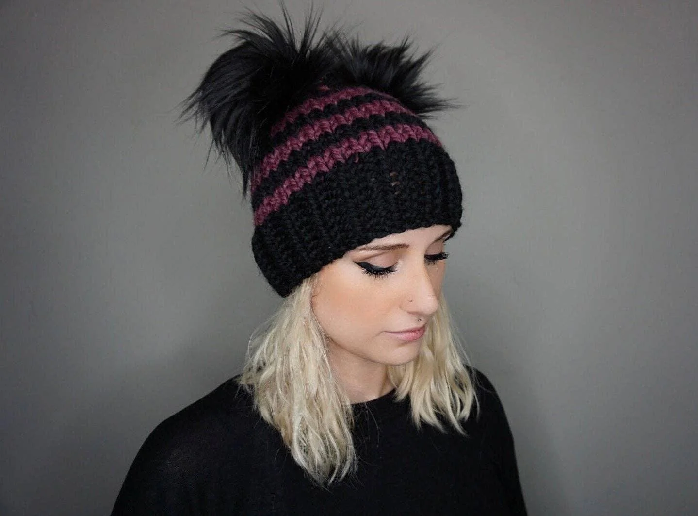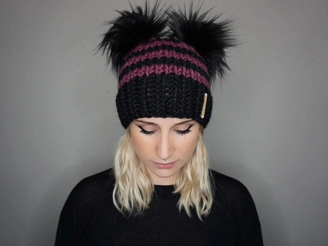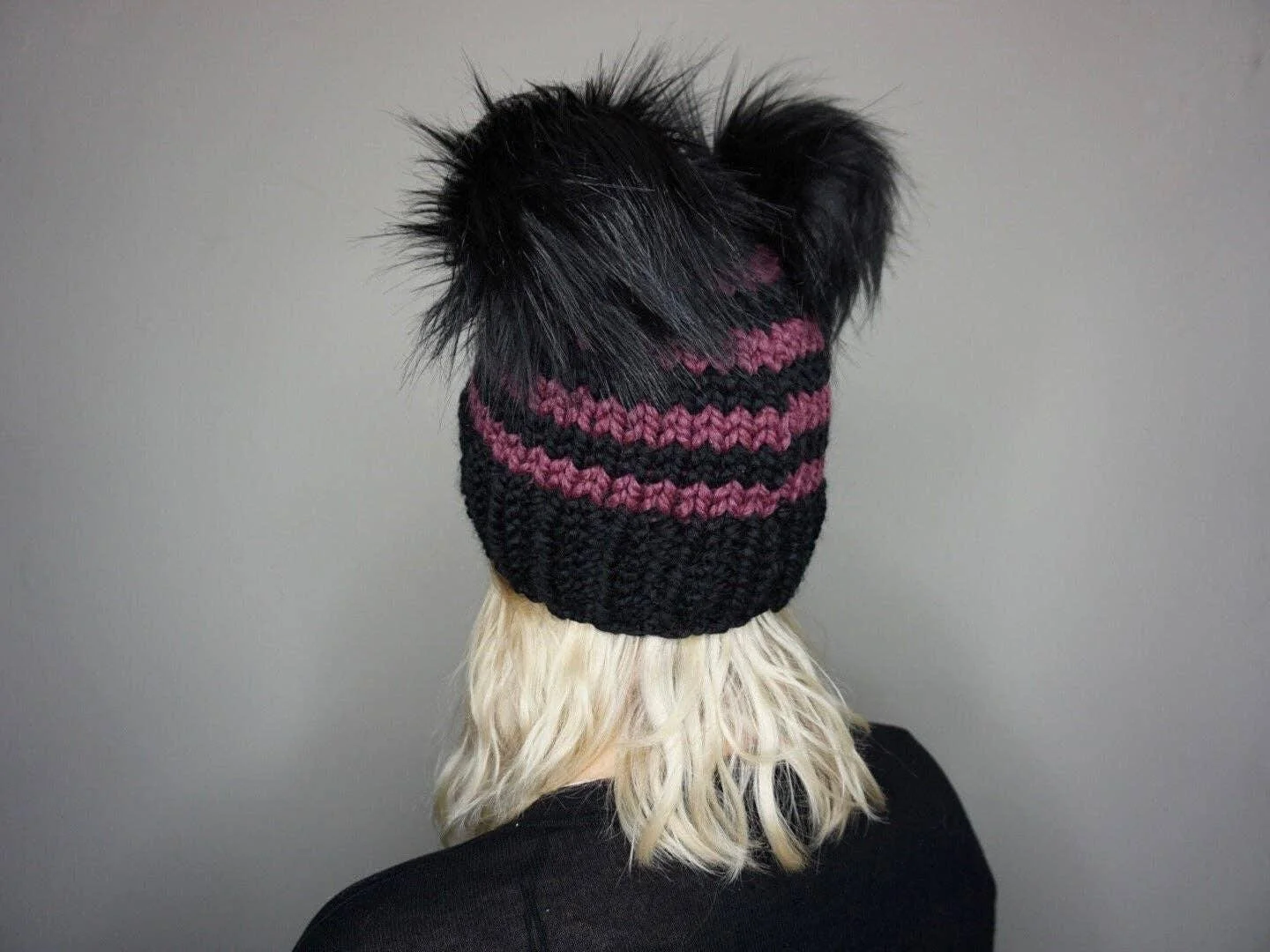 •fitted knit beanie with two faux fur poms